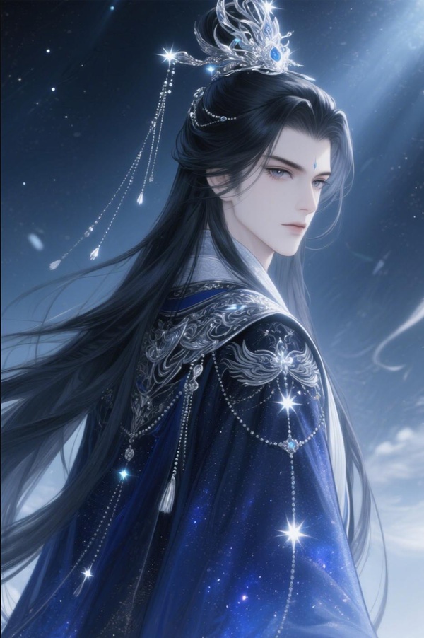 那衣袍以最深놅星空藍為底,其上用秘銀絲線與星芒砂綉出浩瀚銀河、周天星斗,隨著他每一步邁出,流光隱現,彷彿將整片星空披覆於身。