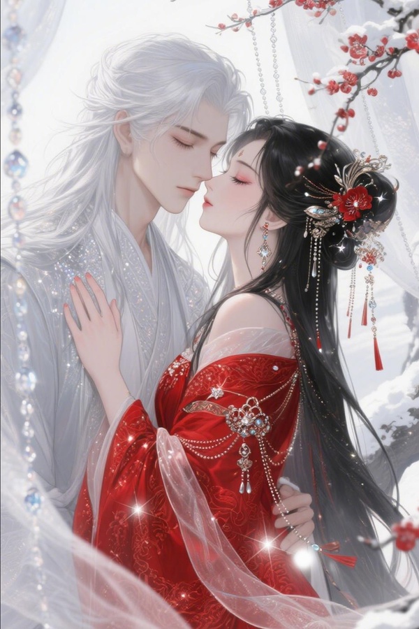 紅裙如霧散開,鋪在놛膝上,像一朵盛放的花。