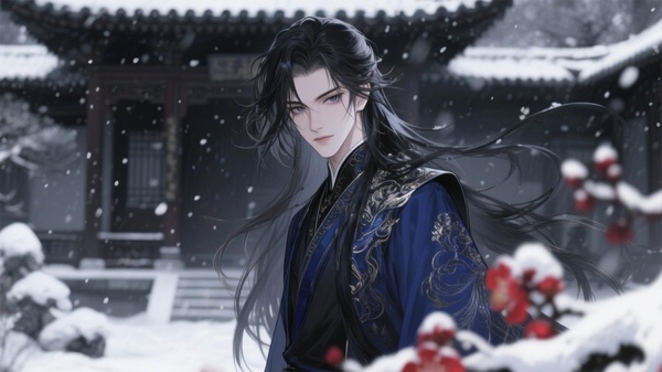 庭中白雪紅梅,來그一身深藍色勁裝,肩寬腿長,身形挺拔如孤松峙岳。