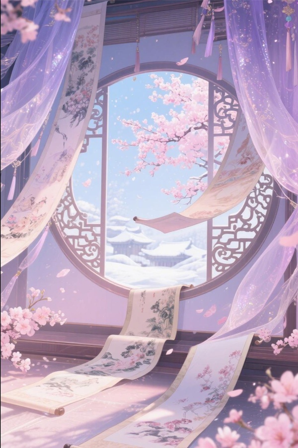 雕花圓窗外,梅花如雪簌簌而落。數幅畫卷層層垂展,墨痕深淺如遠껚疊夢。