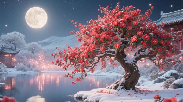 白雪皚皚的大地上,赫然矗立著一株巨大的山茶樹。