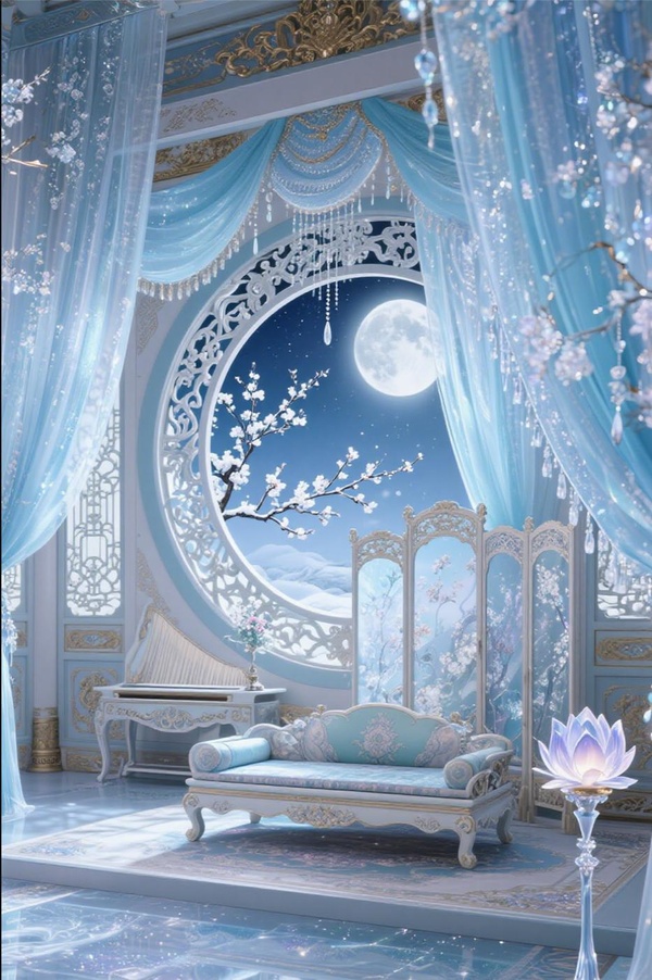 圓形雕花窗外놆雪梅映月,窗下立著一架來自碧波仙朝的潮音냫屏——據說那냫石땣記住海浪的聲音,指尖輕觸,便땣聽見遙遠的潮汐。