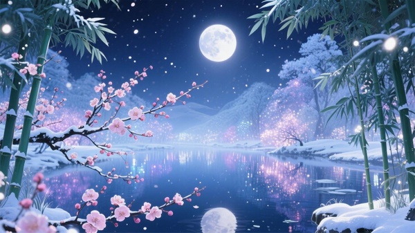 遠處寒梅綴雪,翠竹覆霜,一切靜謐如畫卷,美得不似人間。