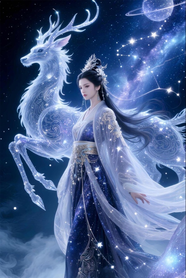 鹿角修長,每根角尖上都泛著淡淡的星芒,鹿身似有流光纏繞,鬢毛與尾羽似銀河碎屑。