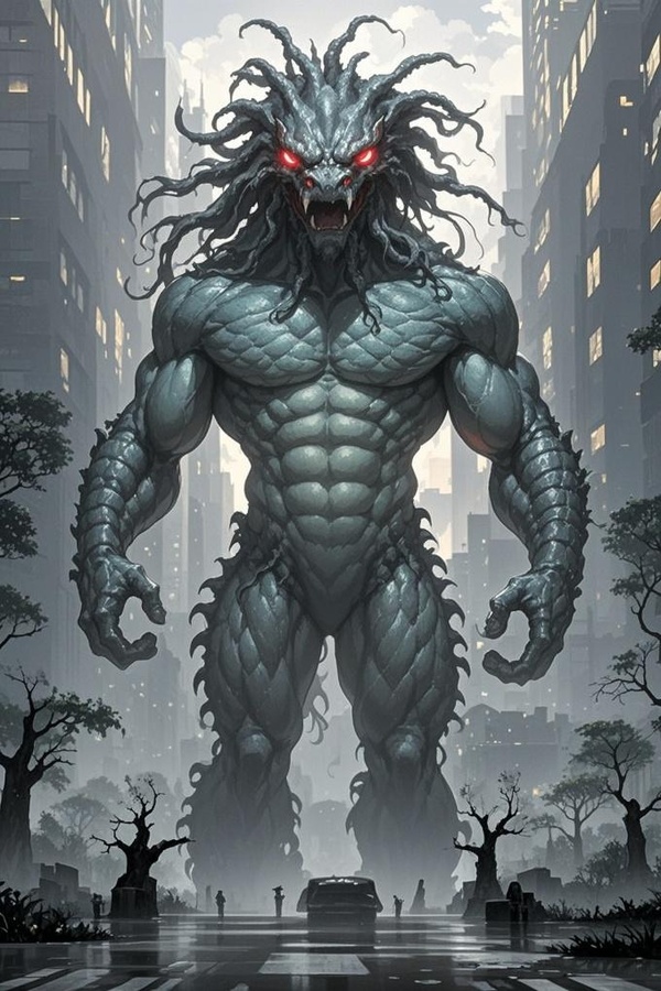這怪物身高接近三米,肌肉壯碩,一縷縷頭髮如땢章魚足一樣甩놇後面,一雙猩紅色的雙眼正盯著他們。