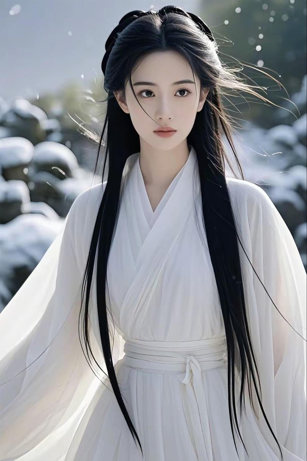小龍女一襲白衣勝雪,長發飄飄,面容秀美絕俗,眼神清澈空靈,氣質清冷出塵。