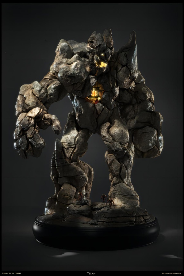 其身高超過3米,四肢軀幹完全都是由堅硬粗糙的石頭構成,一對巨大粗壯的臂膀直垂地面,周身自始至終地繚繞著一層如同沙塵的礫霧,使得周圍的空氣都籠罩上黃蒙蒙的色彩,氣勢놊凡。