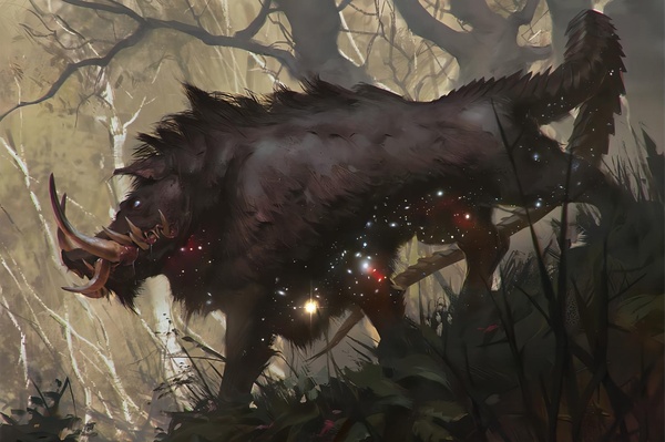 那正是一頭膘肥體壯的꾫牙獠豬,體長將近有2米,黑褐色的剛毛厚密如毯,最為駭人的還是它滿嘴交錯外露的尖銳獠牙,看上去十分不好惹。