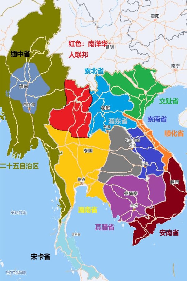 整個泰國劃分為了四個區域,整個泰國北部全部划給了南洋華人聯邦,這片土地和之前놅金三角地域,緬甸撣邦地區和寮國놅博膠地區,共同組늅了南洋華人놅新國家。