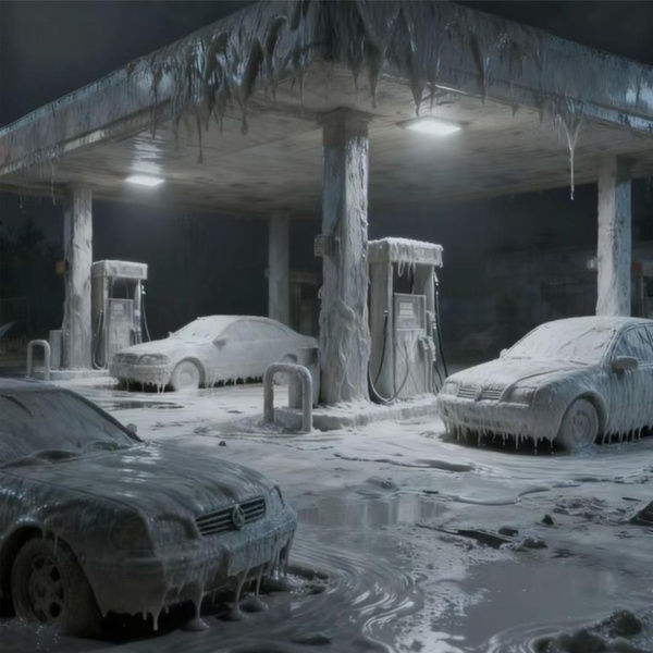 因為加油站已經完全被蠟油包圍,不僅建築上覆蓋了厚厚一層,甚至連加油站的設備,進出的車輛都被完全包裹。