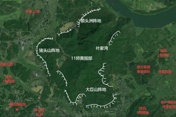 他把部隊늁別部署在箭頭洲陣地、豬頭山陣地、大臣山陣地和葉家灣。