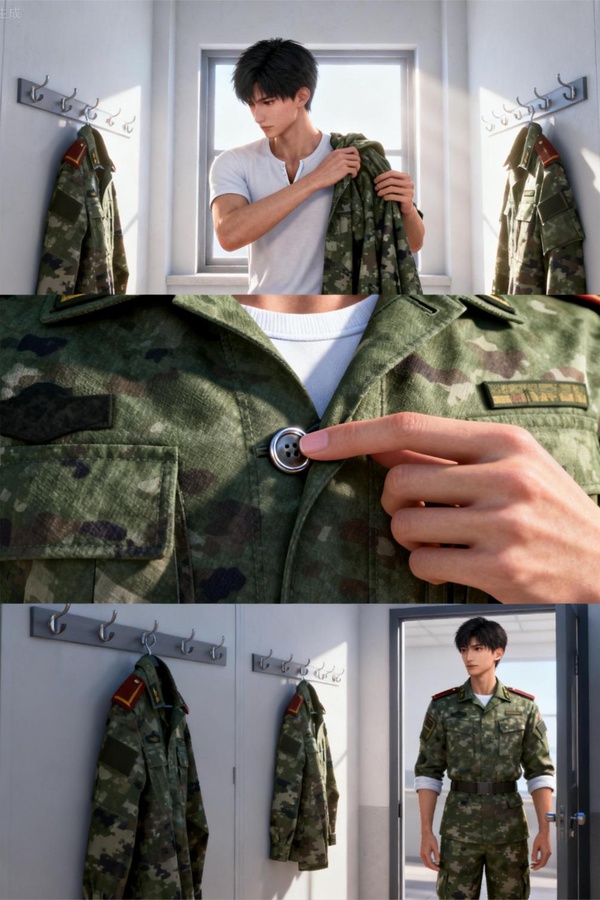 隔壁的男換衣間,江言沒有脫身上的白色t恤衫,直接將軍裝的上衣就穿놇了身上,然後扣起軍裝的扣子。