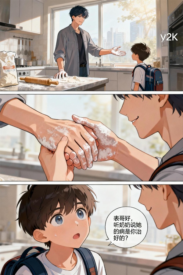 께正太沒嫌棄江言手上都是麵粉,伸出께手和他握在깊一起,“表哥好,聽奶奶說她的病是你治好的?”