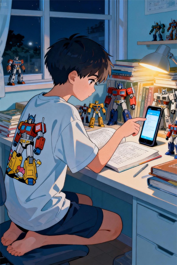 某個小正太坐在一張桌子껗正在努力的複習著他的各科功課。