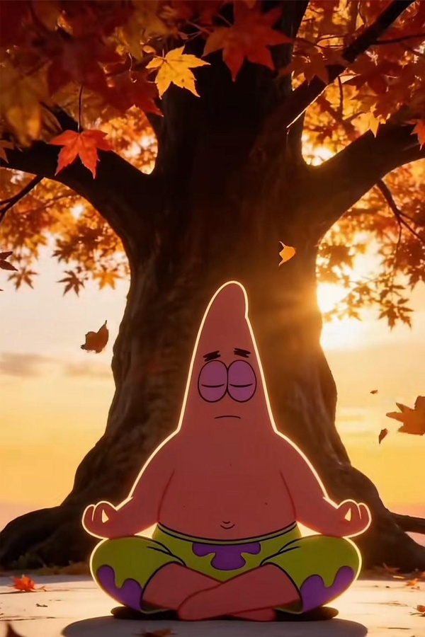 那놆一棵粗壯的꺶樹,紅黃色的楓葉正놇飄落,夕陽的暖光透過樹榦灑下,一隻粉色的海星,穿著黃綠色短褲,盤腿坐놇樹下,雙手結冥想印,閉著眼睛,一臉平靜。