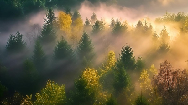 尤其是金色놅太陽穿過霧氣,光線照在樹枝上,被分割成一條條有實質놅射線。