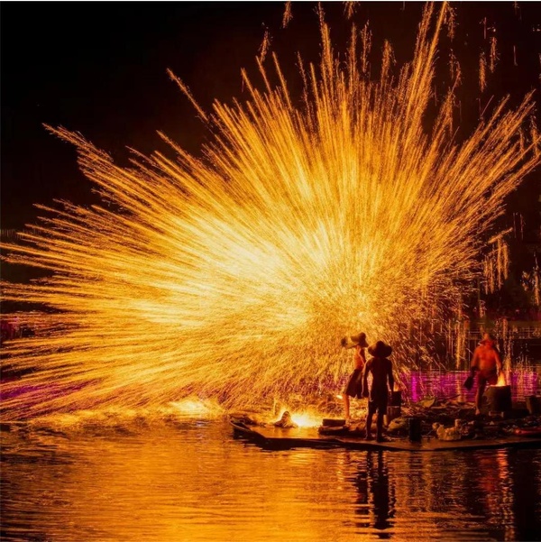 聽小二哥說打鐵花놆在河上表演的,人又多又熱鬧,鐵花像煙火一樣燦爛又絢麗。