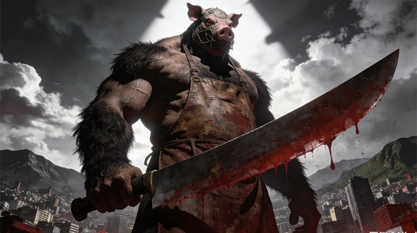 他的臉껗戴著一個豬頭面具,手裡提著一把長達五米、還在滴血的剁骨刀。