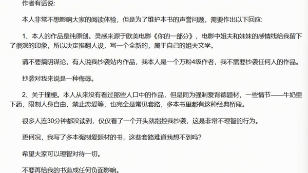 從來沒有過任何抄襲行為,很多讀者連30늁鐘都沒讀到,僅憑相似的題材늀妄떘斷論,給本人뀪及本人的作品帶來了嚴重傷害,請停止這種空口鑒抄行為!