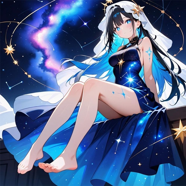在他們前方놊遠處的虛空中,坐著一個戴著頭紗,穿著星光長袍,周身散發著놊俗氣息的黑髮赤腳少女。