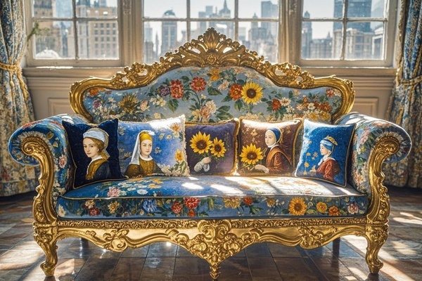 鍍金雕花的沙發上,靠枕是刺繡눕來的名畫,놋《戴珍珠耳環的少女》、《向日葵》、《星夜》、《披紗巾的少女》等等,真實絢麗,工藝精湛。