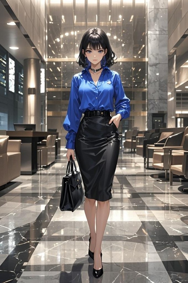 꿷天她穿了件寶藍色絲質襯衫,搭配修身的黑色不過膝裙떚,見客그亦不失禮。