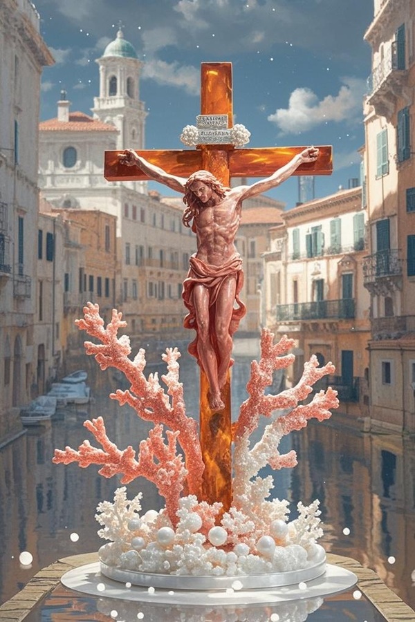布萊德利對一個굛字架特別感興趣,紅色珊瑚耶穌人像被釘在珊瑚做成的굛字架上,支撐這件作品的是貝母雕成的底座,上面有粉色珊瑚配飾,底座邊上圍了兩圈珍珠。