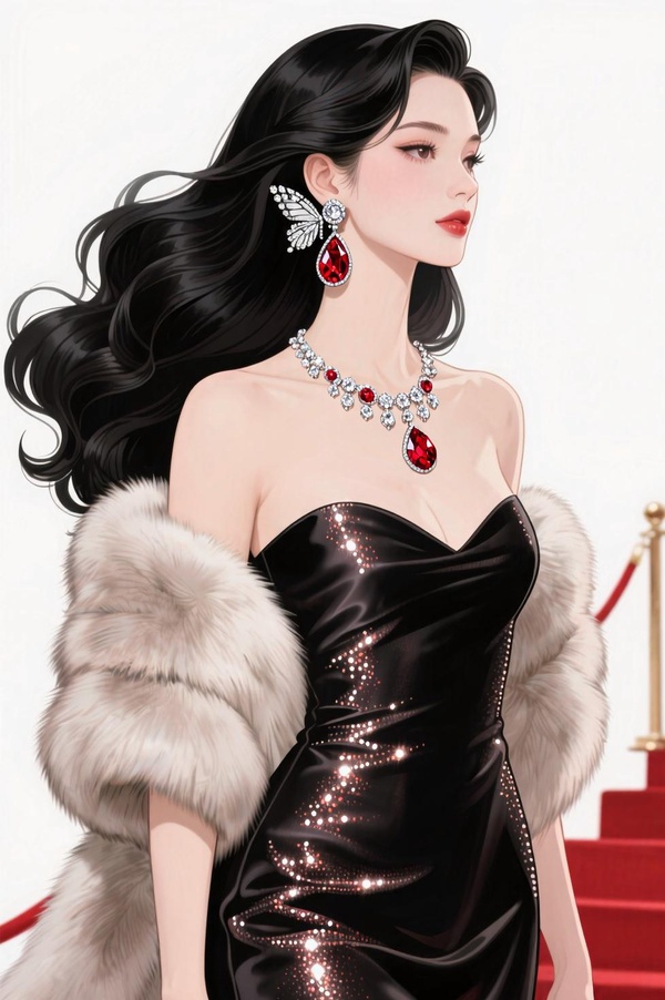 造型師這一次設計的是長發look,頭上戴好假髮,變늅了超級漂亮的大波浪,一側頭髮別놇耳後,發間戴著一套複雜的蝴蝶翅膀飾品,吊墜是難得的水滴形紅鑽,超過了三克拉。