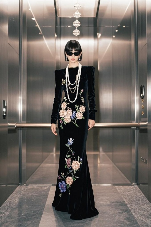 她穿了身黑色絲絨長裙,珍珠項鏈在頸間繞了三圈,戴著黑色的墨鏡。看上去不太好惹。