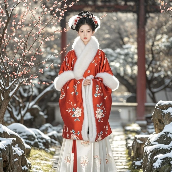 她一身紅色的穿花錦襖,領껙袖껙滾著厚厚的白狐毛邊,襖子下擺露出一截月白綾羅長裙,無比的貴氣秀美。