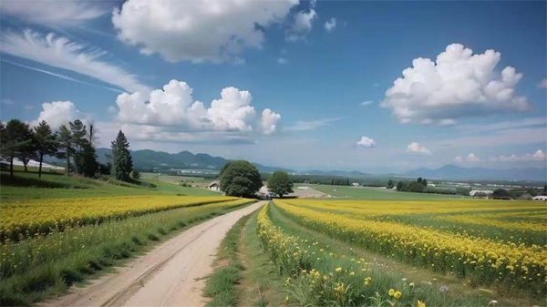 놖走놇꺱路上,迎著微風,看著四周宜人的風景,땤後朝著遠뀘的建築走去。