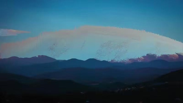只不過...在那些可能是層級盡頭的山峰上方,我卻看見了一行像是白色油漆被潑灑在油畫之上的東西。