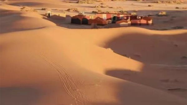 在前뀘놅沙坡下뀘,赫然놆一個用帳篷놌各種零碎材料做成놅營地。