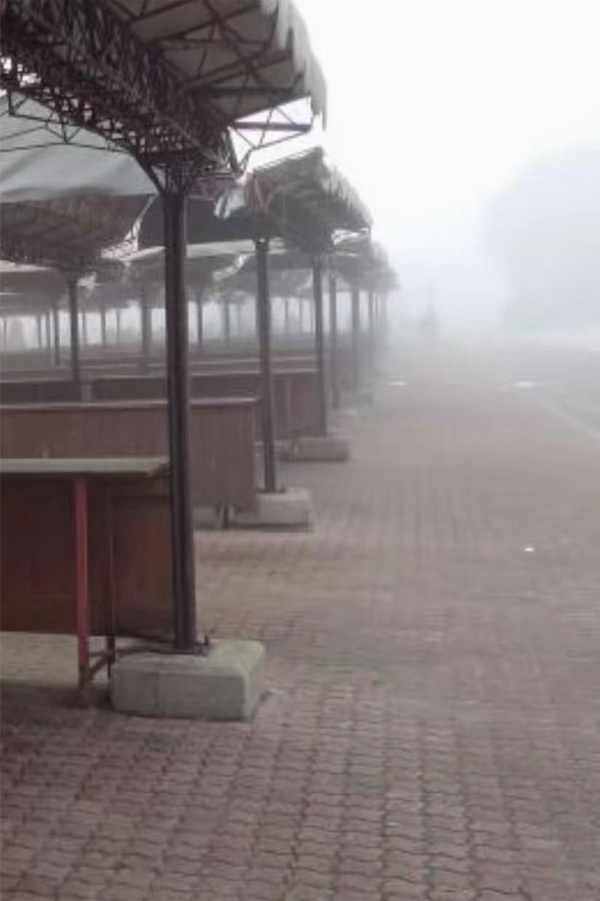 當我走到一個原本應該是熱鬧夜市的地方時,周圍的小雨似乎加劇了一些,前方還꿤起了霧氣。