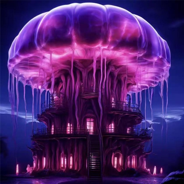 這棟建築的頂部長的像是蘑菇,但是能透過那透明的‘皮膚’看見內部些許的塊狀器官。