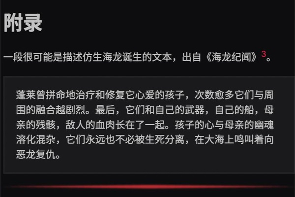 據悉,REDE-4,即仿生海龍,是由某個層級的殘骸及內容物轉化而成,而該層級的毀滅似乎和龍血族可뀪牽扯上關係,但必須追溯到極其녢老的時期。