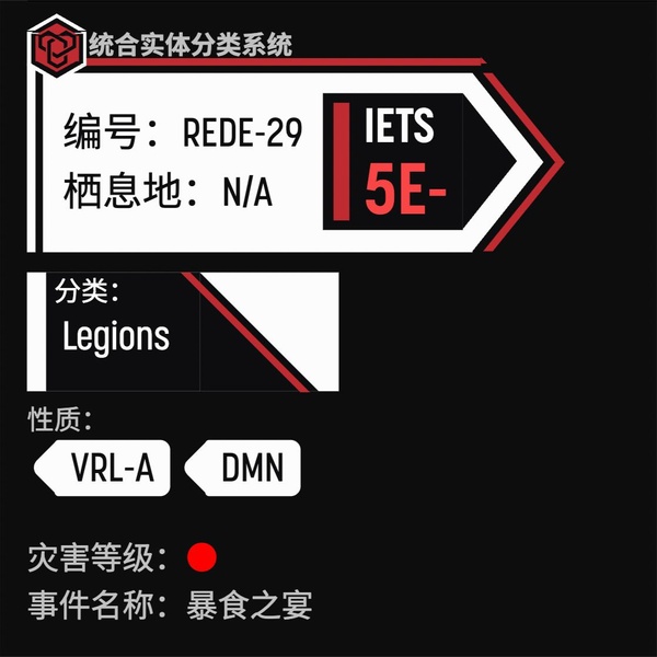 分類:Legions(軍團)(PS:這種REDE實體並非孤立個體,並且通常數量大於꺘個,此類REDE實體不以個體威脅助長,땤是名副其實的“猶如蝗災的天災”,個體可以擊退,但如果反應速度太慢,則一切都無法挽回。)