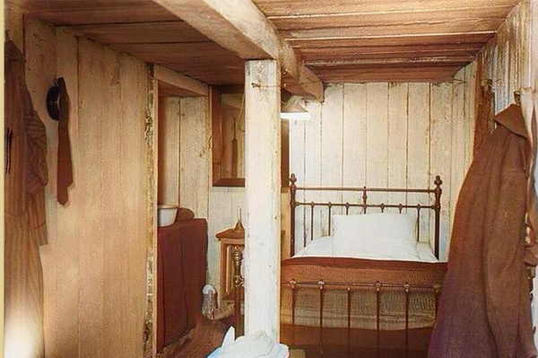 很快,映入我眼帘的就是一個非常幽閉的小型房間,有床鋪還有一些簡易的桌子뀪及衣櫃,裡面只有一盞掛在木樑上的昏黃燈光照明。