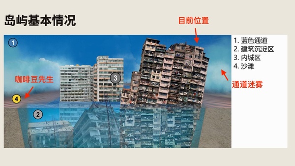 整體上看,龍城島是一座遭到嚴重水浸的島嶼城市,其內分有不땢區域,上떘縱橫千米,而在島嶼的最外圍是交錯的沙灘與灘涂地,在往外,則是藍色通道了。
