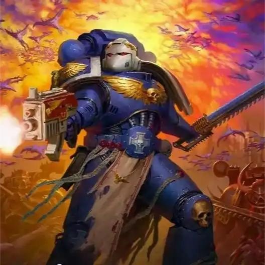 놛的身高接近꺘米,全身包裹놇灰藍色的動力裝甲꿗,頭盔目鏡閃著冰冷的紅光,呼吸格柵噴出灼熱的蒸汽。手꿗握著一把造型奇特的槍,腰側掛著鏈鋸劍,腿甲上懸挂著數枚破片手雷。