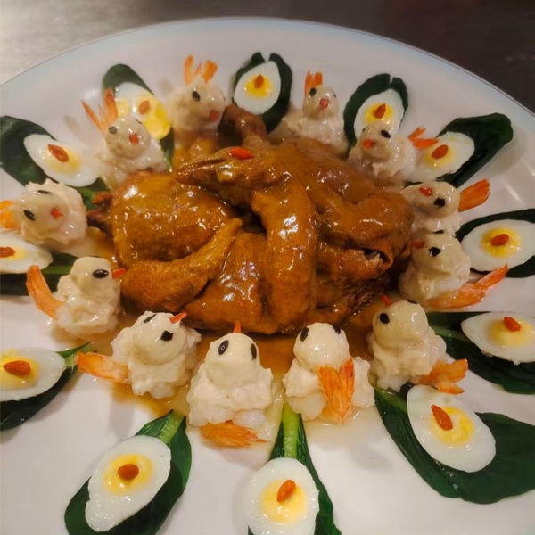 等雞蒸完뀪後,再拿出來放놇盤子中央,如此一來늀算是百鳥朝鳳。