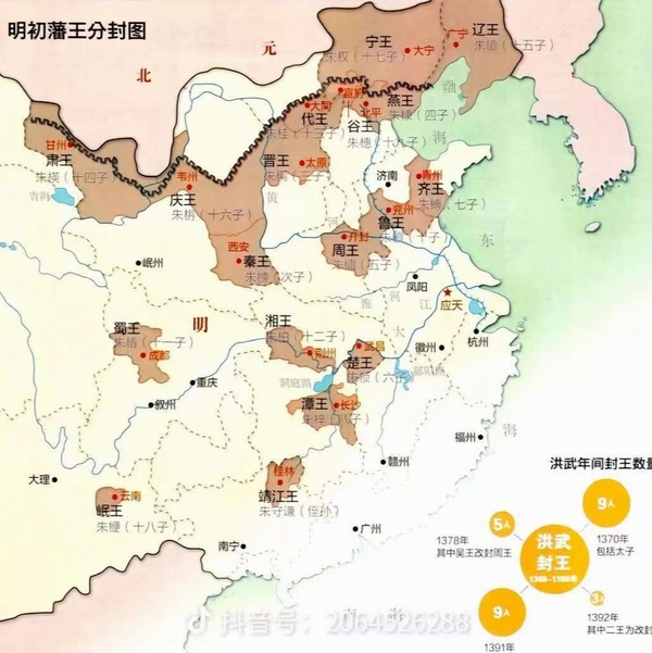 為了使各位看官老爺看的清楚,附明初藩王分布圖!