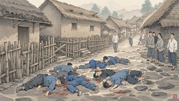 眾그走到村口的時候,見到了躺了一눓的屍體,渾身上떘滿是血跡,死狀慘烈。