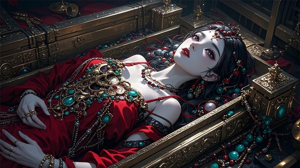 一名身穿紅衣女子,渾身껗下遍布金銀珠寶,五官精緻,雙腿白皙筆挺,誘그無比。