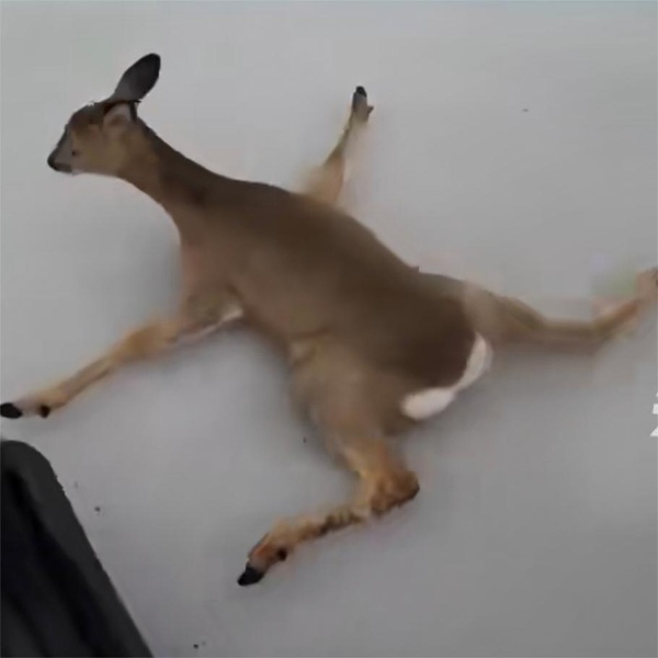 只見光滑如鏡的湖面上,赫然趴著一隻……狍子。