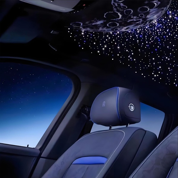 這輛車的星空頂不僅僅有忽明忽暗的星星,還有流星劃過,甚至還有幾顆藍色的星辰,而最不同的地뀘在於,在車頂靠近車窗的位置,竟然綉著一個月球環形山的圖案。