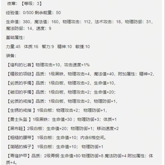 눃命值:380,魔法值:160,物理攻擊:112,物理防禦:31。