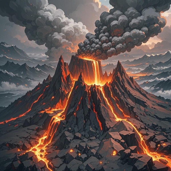 火山口裡岩漿翻騰,時不時有黑紅的岩漿從洞口噴出,沿著火山一路流向大地。