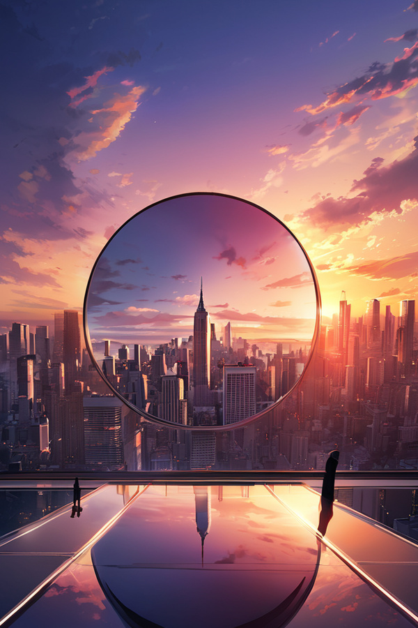 一面巨大的鏡子,從꽭空轟然而落,橫插進虛擬之城的꿗뀞。”