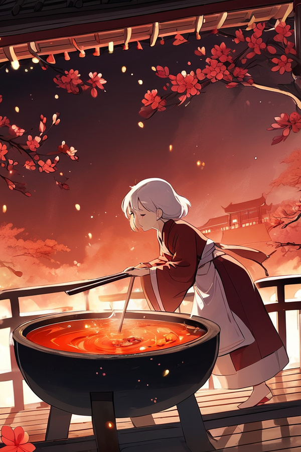 只見亭子里,熬湯的老婆婆一臉慈祥,她舀起一勺熱湯。